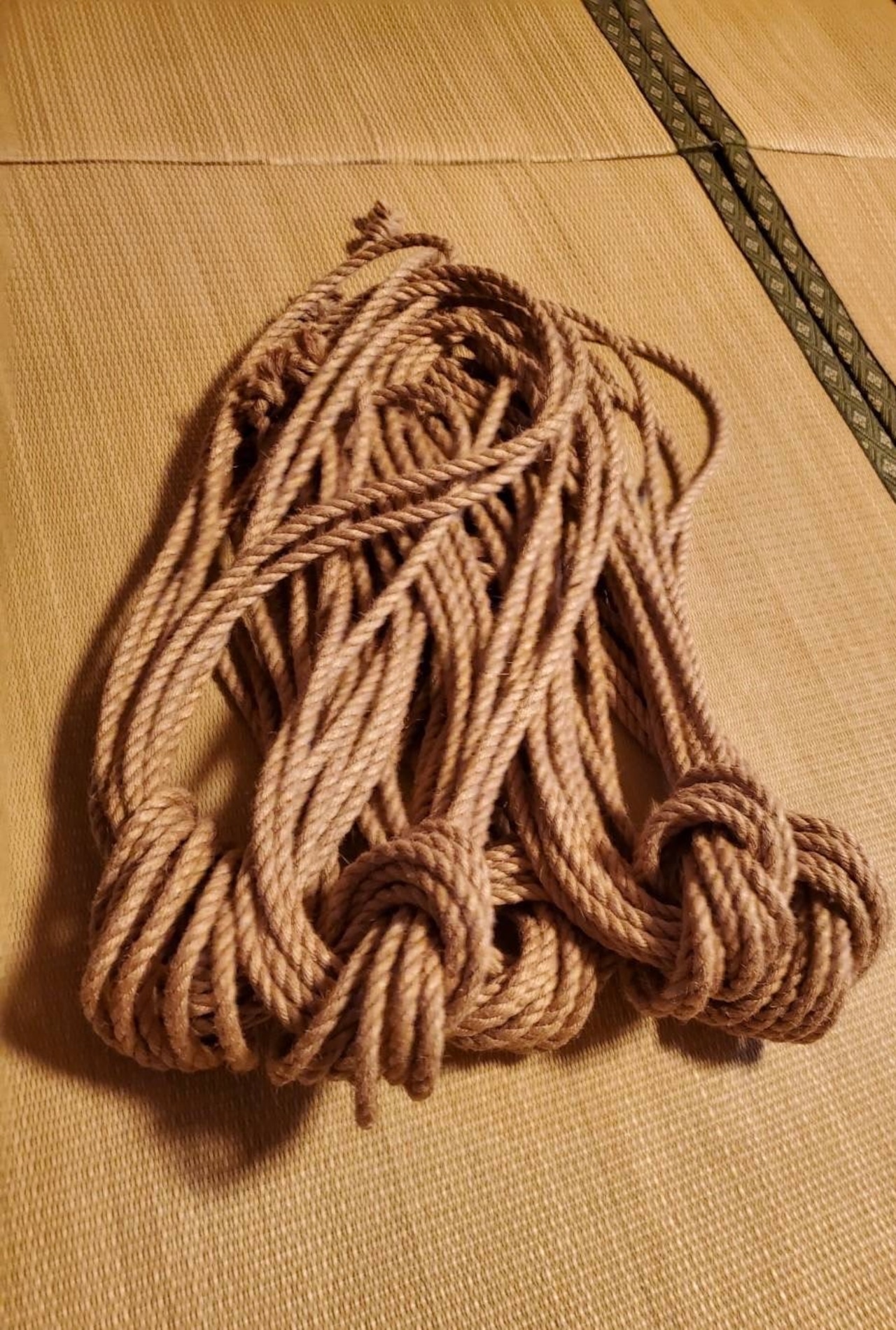 ロールから切り出したそのままの麻縄、8メートルを5本セットにしました。毛羽焼きや油鞣し、染色などの加工は一切施していない「元縄」なので、練習用や加工ベース、試作用に最適です。オリジナルの仕上げを行いたい方や、コストを抑えて麻縄を体験したい方におすすめです。